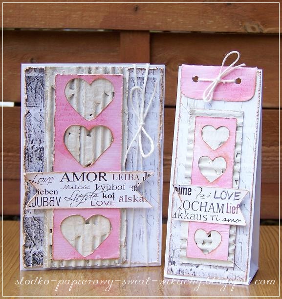 W ramach inspiracji od DT wykonałam walentynkowy zestaw, na który składa się kartka oraz torebeczka do której można spakować słodki upominek. Torebkę wykonałam z koperty białej DL